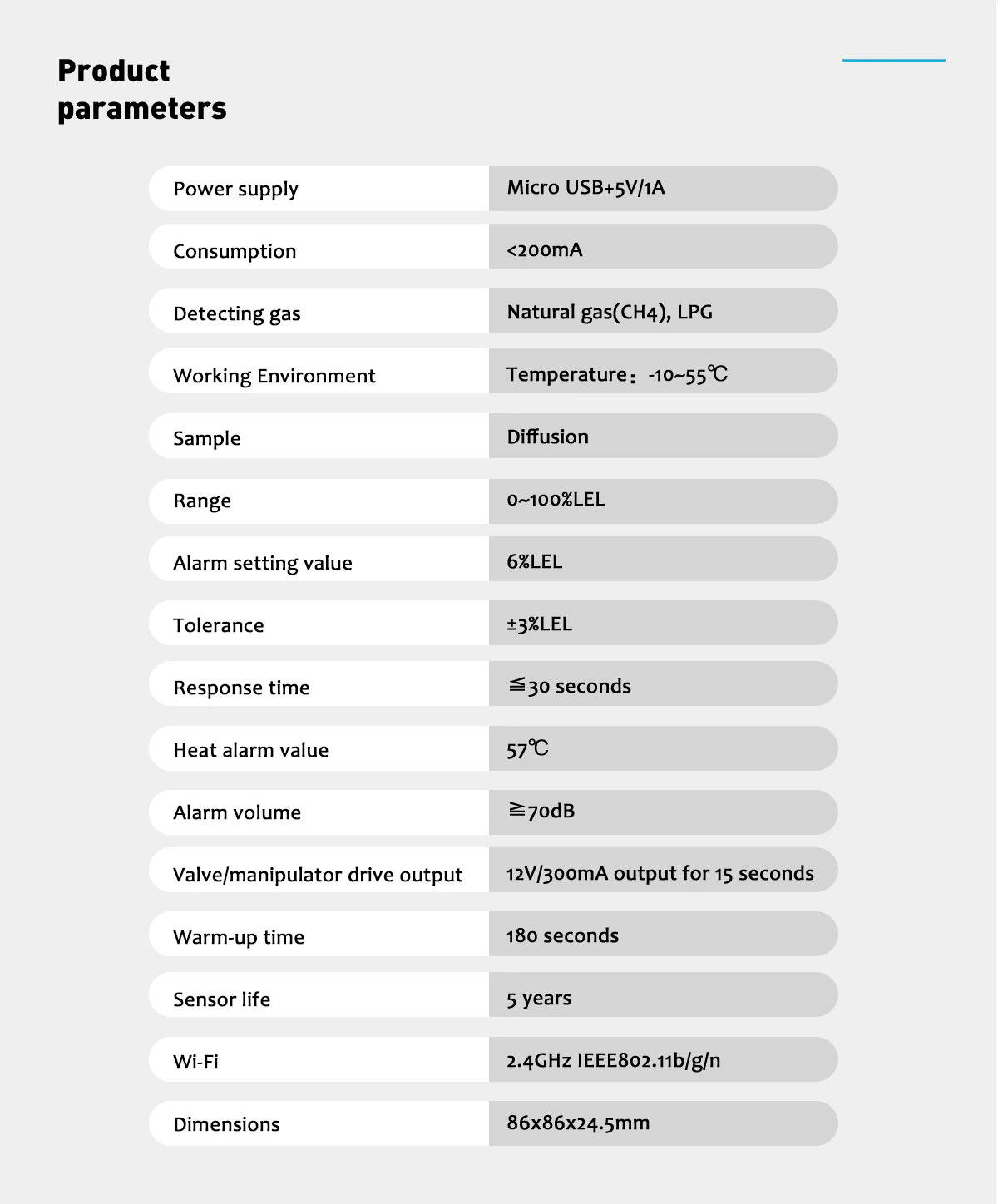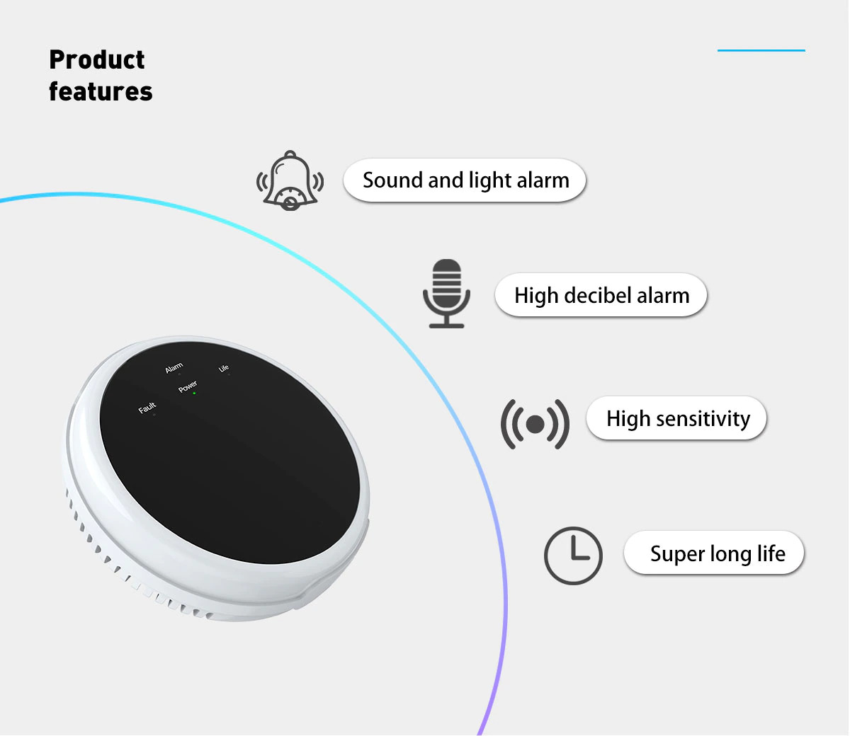 - On-site high decibel alarm sound, with LED indication